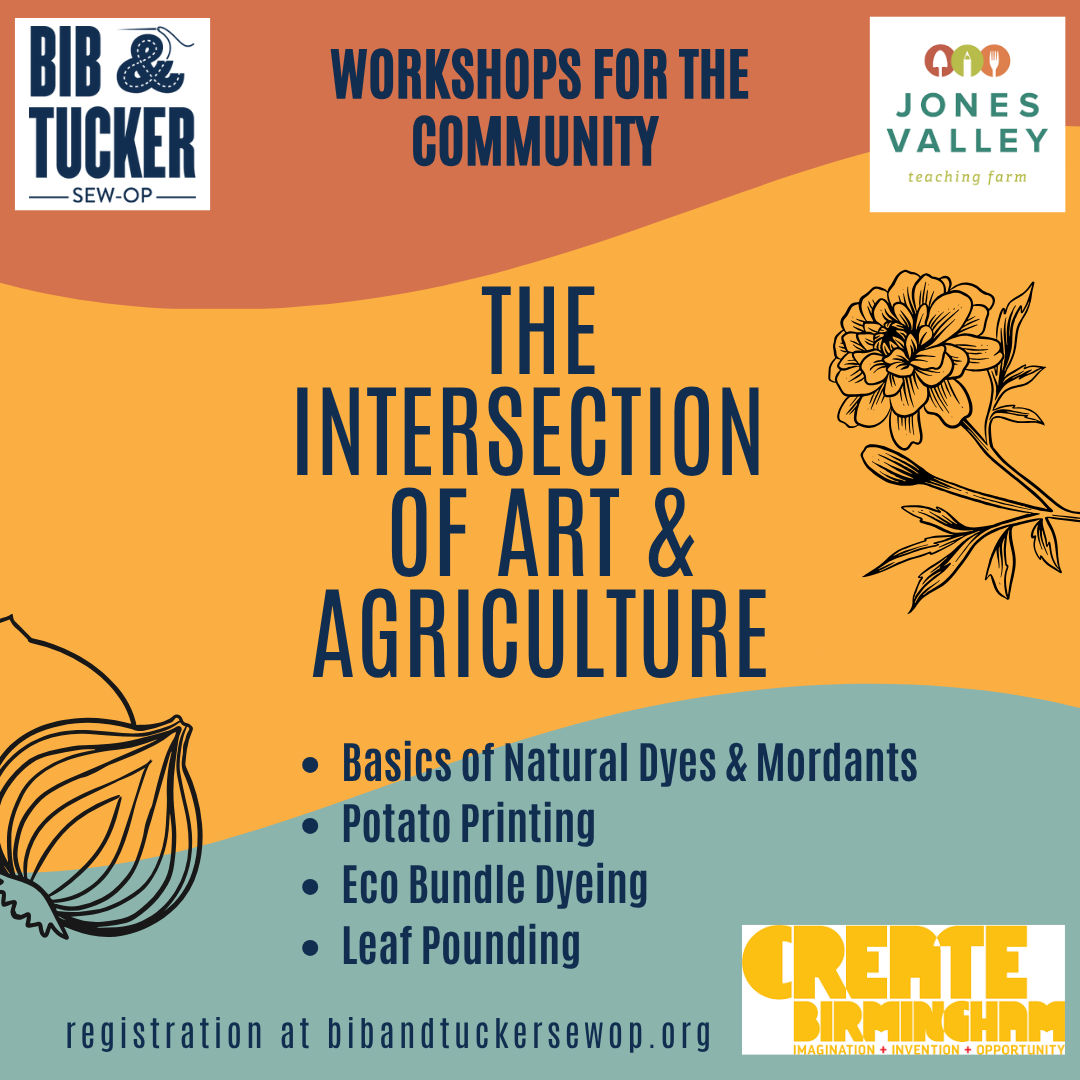 The Intersection of Art and Agriculture, a series of four workshops that will teach the public how to dye and embellish textiles using food, leaves, and flowers grown at Jones Valley Teaching Farm. The goal of this programming is to educate the public that attractive textile-based creations can be made sustainably with materials that can be readily found growing around us in our yard. This collaboration will demonstrate that the intersection of art and agriculture can be very fruitful and good for the planet. These workshops are made possible by The City of Birmingham Community Arts Grant through Create Birmingham.