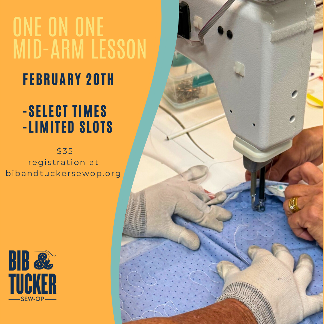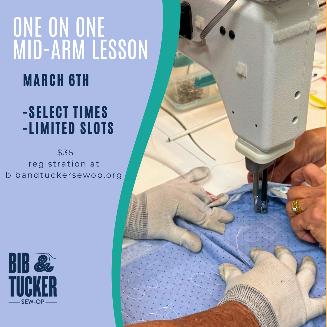 Do you want to learn how to use a mid-arm machine to do basic quilting for your quilting projects? Join Bib & Tucker Sew-Op member Chita Drinkard, for a 50 minute focused one on one session on how to use a mid-arm sewing machine for basic quilting. Open to ages 12 and up, with a solid knowledge of how to use a standard sewing machine.